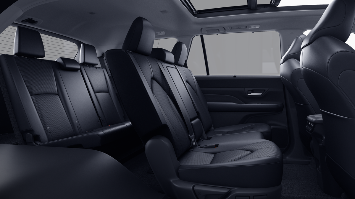 - 7-passenger seating with second-row fold-down captain's chairs and fold-down inboard armrests, adjustable headrests and two cup holders mounted on the floor; and 60/40 split, fold-down third-row seats with sliding headrests and recline function