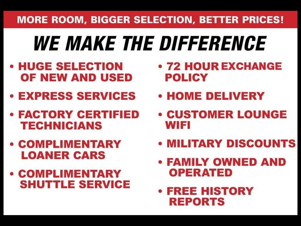 All vehicle specifications, prices and equipment are subject to change without notice. See above for information on purchase financing and lease program expiration dates. Prices and payments (including the amount down payment) do not include tax, titles, tags, documentation charges, emissions testing charges, or other fees required by law or lending organizations. The estimated payments may not include upfront finance charges that must be paid to be eligible for the purchase financing program used to estimate the APR and payments. Listed Annual Percentage Rates are provided for the selected purchase financing or lease programs available on the current date. Program expiration dates reflect currently announced program end dates, but these programs are subject to change at any time. Lessees will be financially responsible for mileage beyond the elected quantity and for vehicle maintenance and repairs and excessive vehicle wear. Option to purchase at lease end for an amount may be determined at lease signing. Payments may be higher in some states. You may not be able to combine other incentives with the purchase financing or leasing programs presented above. Residency restrictions may apply. See dealer for details. Listed APR, down payment, payments, incentives and other terms are estimates for example purposes only. Information provided is based on very well-qualified buyers or lessees. The payment information provided here is not a commitment by any organization to provide credit, leases or other programs. Some customers may not qualify for listed programs. Your terms may vary. Lessor must approve lease. Credit approval required. * The advertised price does not include sales tax, vehicle registration fees, other fees required by law or finance charges. Price includes dealer doc fee of $998. * Images, pricing and options shown are examples, only, and may not reflect exact vehicle color, trim, options, pricing or other specifications. ALL VEHICLES ADVERTISED ARE SUBJECT TO PRIOR SALE. PLEASE SEE DEALER FOR CURRENT AVAILABILITY. Listed APR, down payment, incentives & other terms are ESTIMATES for example only. Information provided is based on well qualified buyers; the payment information provided is not a commitment by any organization to provide credit, leases or other programs. Credit approval required. Not all applicants will qualify. **With approved credit. Terms may vary. Monthly payments are only estimates derived from the vehicle price with a 72 month term, 4.9% interest and 20% downpayment.